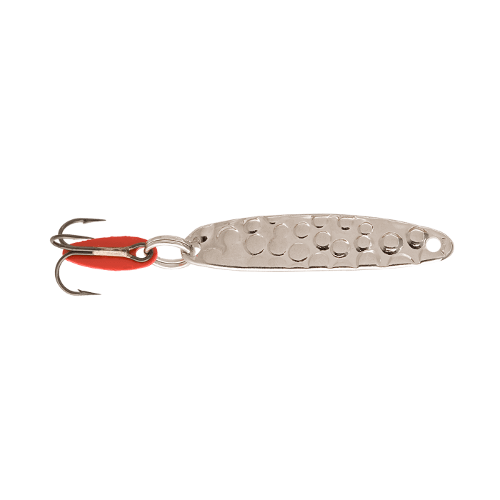 Use a #2, 3, 4 or 5 Swedish Pimple, Flute Spoon or Vingla for best results on pan fish and game fish in shallower waters. Used with a lift, fall and pause retrieve, they are good spinning spoons for all game and pan fish. To use as a spinning lure with a straight I or interrupted retrieve, reverse the location of the red flipper for more kick to the lure (i.e. remove the flipper and reinstall it on the flat side of the Pimple). A bonus Single Baiter Hook and Flipper is supplied with sizes 2,3 and 4.