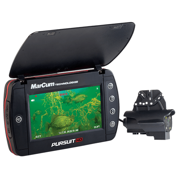 The MarCum® Pursuit HD Camera sets the new standard in mobility while adhering to the innovative design that makes MarCum devices the best in the business. A Full HD image sensor (1920x1080p) offers industry-leading display precision, packing a punch in a pocket-sized 5" LCD. All the on-screen reconnaissance details appear in this MarCum camera, such as temperature, depth, and absolute direction. The built-in DVR lets you record video in up to 3 different sizes—480p, 720p, and 1080p—and take snapshots. Expand your recording library with massive storage up to 128GB microSD card (not included). Updated DVR features include MP4 capability, multiple image output sizes, and cyclical recording. The image itself is so precise, it can support digital zoom, allowing anglers to gather more information on weeds or cover, fish behavior, and jigs on the far end of the wheelhouse. A built-in cable reel and 1/4"-20 port at the bottom of the unit provide convenience and endless mounting options. Whether you're on ice or stationary in a fish-house, the Pursuit HD's rich feature set offers best-in-class tools with the functionality to benefit all anglers.